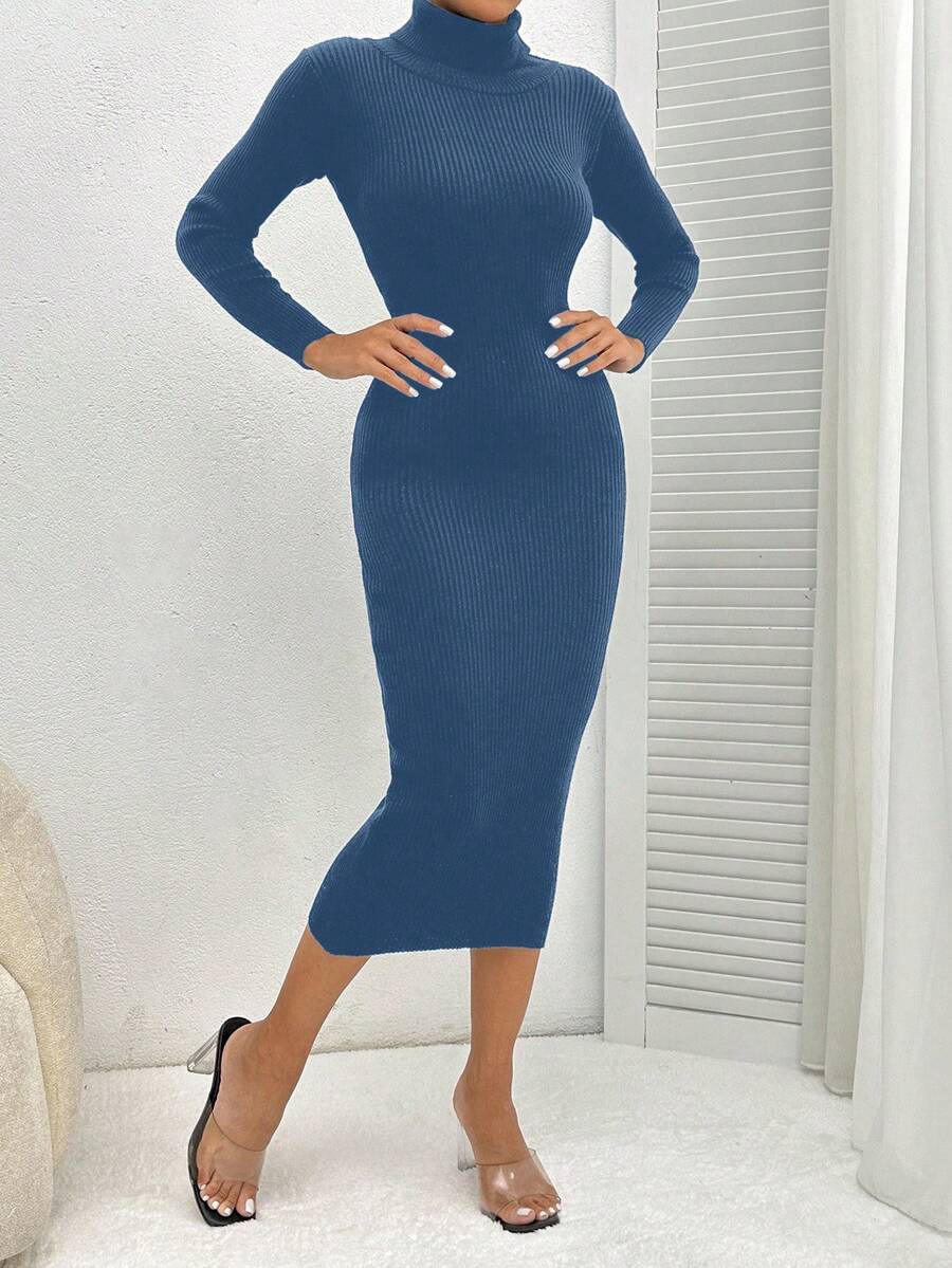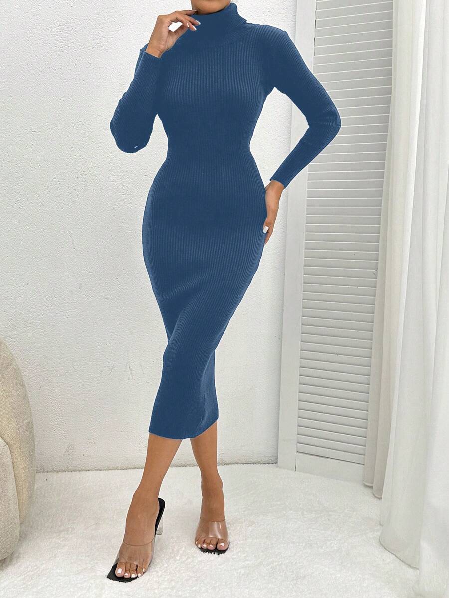 Robe longue col roulé bleu – Élégance ajustée et confort intemporel
